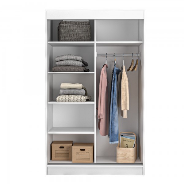 Dressing cu oglinda si usi glisante, produs din pal melaminat, compartimentat cu polite si bara umeras.